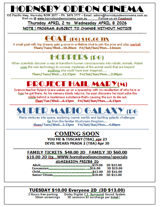 (Click session time to order)"A VISUALLY DAZZLING SPACE ODYSSEY THAT'S CARRIED ALONG EFFORTLESSLY BY THE GRAVITATIONAL PULL OF RYAN GOSLING AT HIS MOST WINNING, PROJECT HAIL MARY IS A NEAR-MIRACULOUS FUSION OF SMARTS AND HEART." -